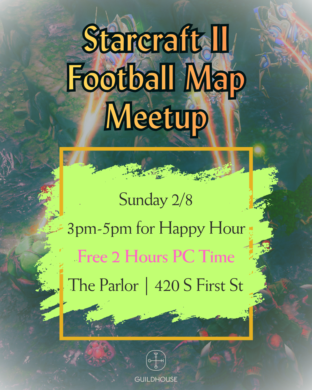 Join us while we play Starcraft II during Happy Hour. 🍻 We'll have a custom football map/game mode to play alongside the big game!